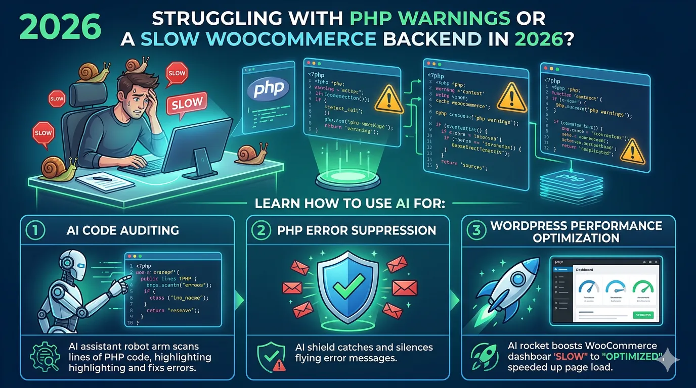 Struggling with PHP warnings or a slow WooCommerce backend in 2026? Learn how to use AI for code auditing, PHP error suppression, and WordPress performance optimization.