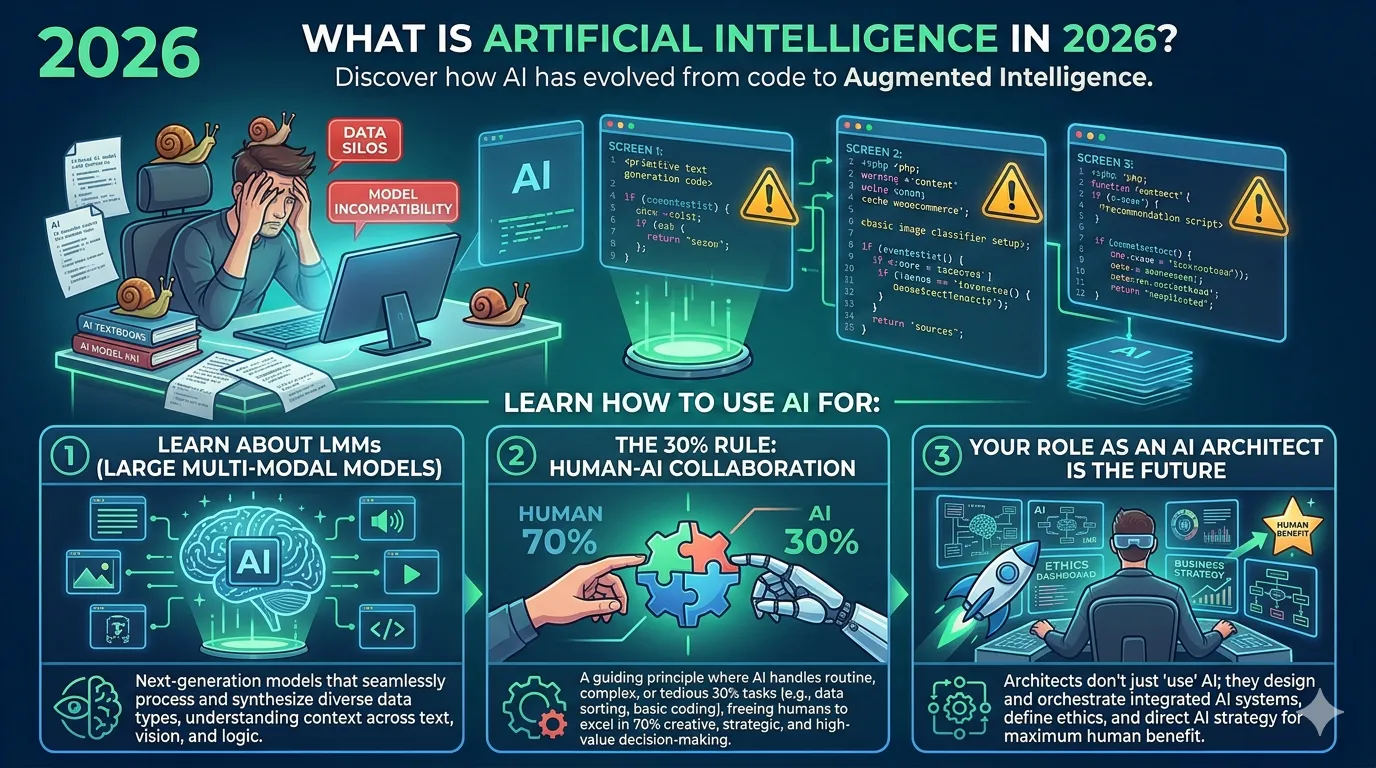 What is Artificial Intelligence in 2026? Discover how AI has evolved from code to Augmented Intelligence. Learn about LMMs, the 30% Rule, and why your role as an AI Architect is the future.